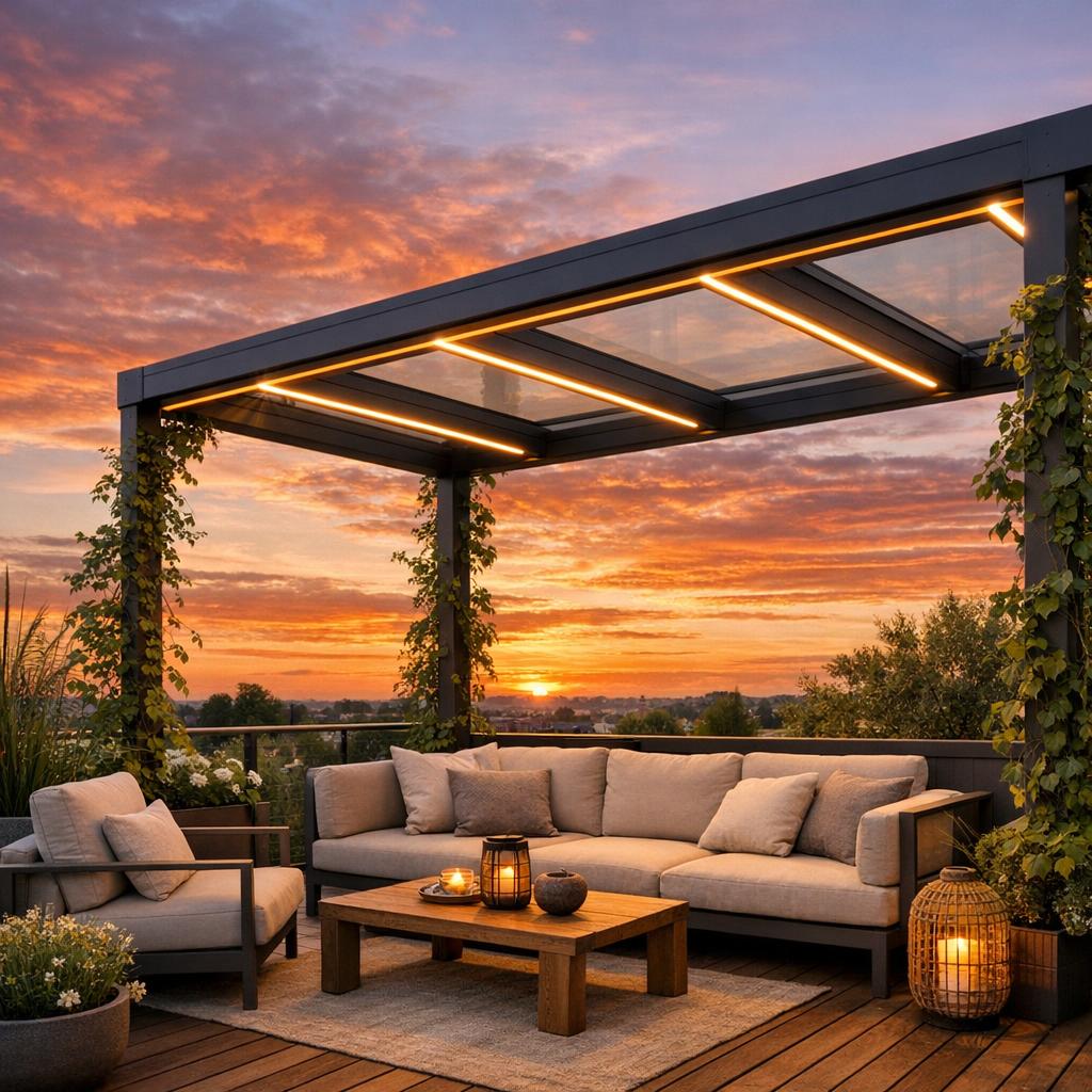 Auch indirekte Beleuchtung, etwa durch in die Überdachung integrierte Leisten, sorgt für eine angenehme Atmosphäre. Solche Lösungen lassen den Außenbereich einladend und modern wirken.